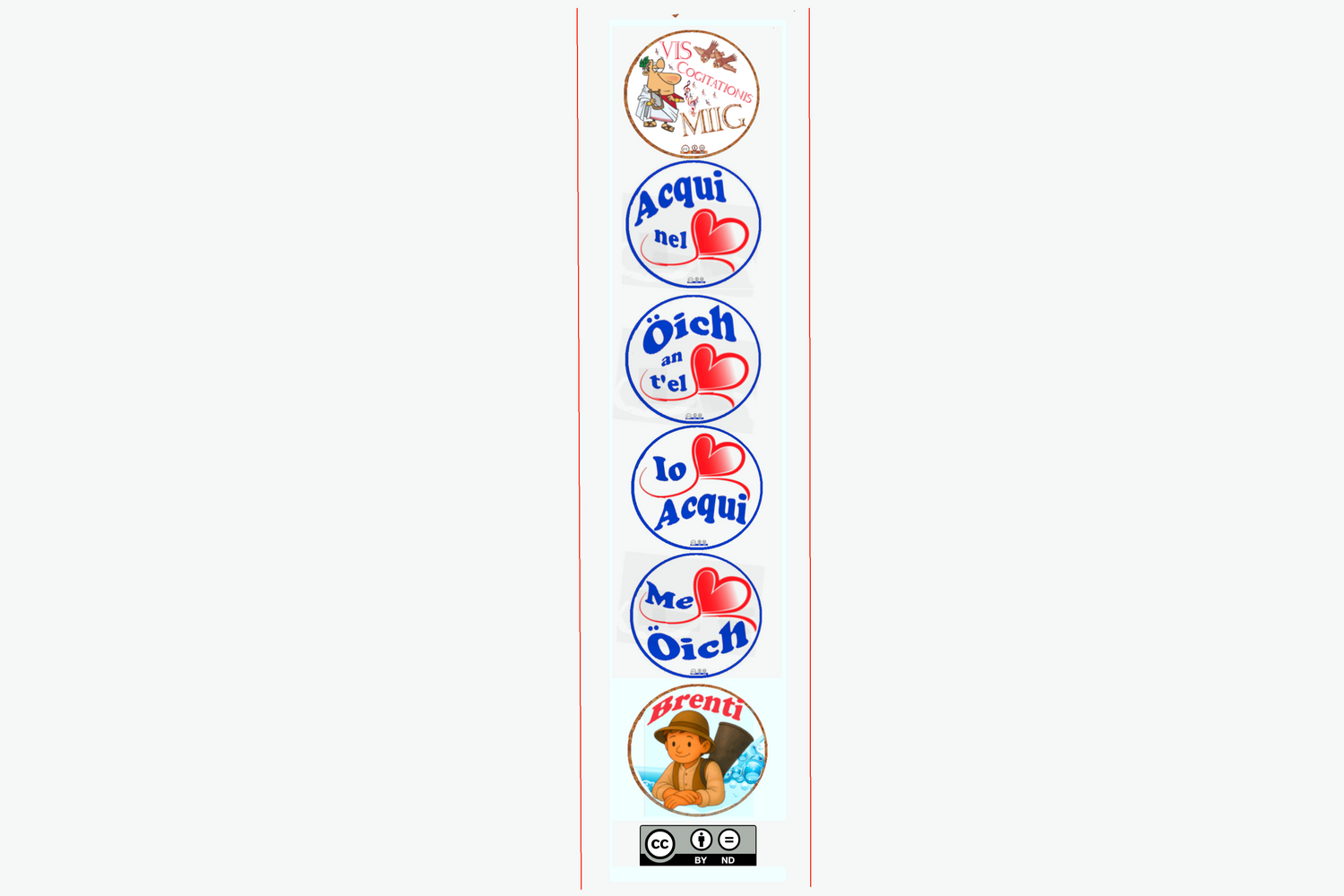 Tutte le grafiche , le linee di abbigliamento e oggettistica di questo sito e delle opere letterarie, licenziate sotto l'egida di CC Creative Commons , per M2G , con i marchi Acqui nel Cuore, Oich an t'el Coer, Io amo Acqui, Me a om Oich , sono create per celebrare la storia millenaria di Acqui Terme e l'orgoglio di essere "Sgaientò" , per nascita o adozione, e sono rivolte a tutti coloro che amano la nostra meravigliosa città e vogliono, spiritualmente e materialmente, averne un ricordo.